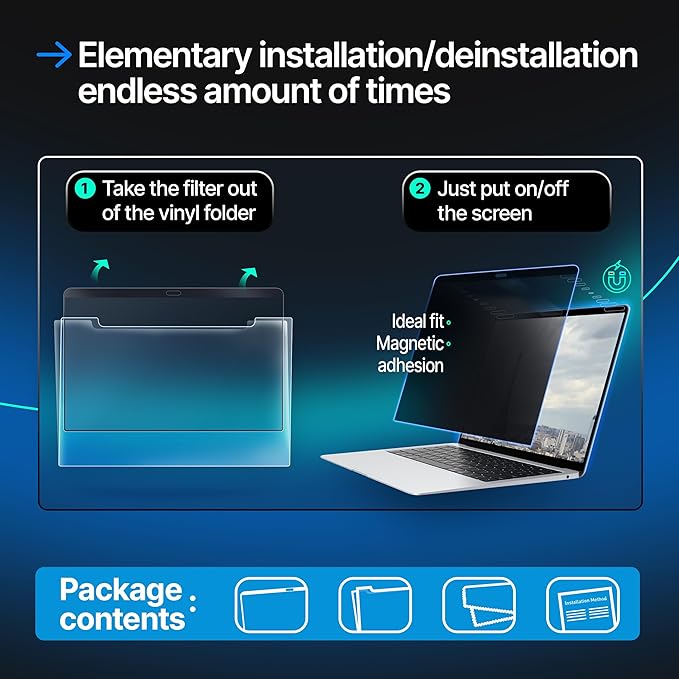 - Easy Installation: The computer screen privacy filter attaches magnetically. Simply snap it on, remove, or reattach as needed, ensuring superior eye protection without damaging your screen