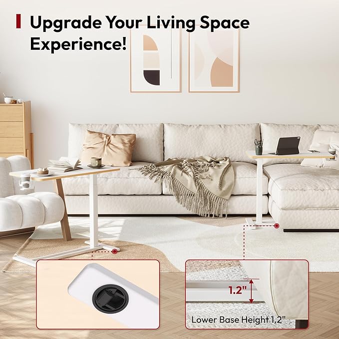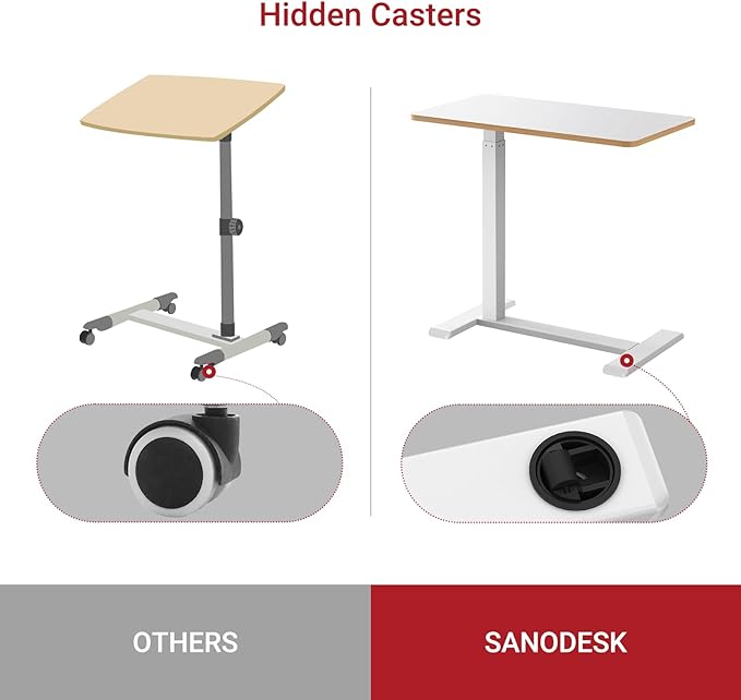 - Hidden Casters-Featuring 4 hidden casters, this overbed beside table glides smoothly for effortless maneuverability. Its low-profile base fits under furniture as low as 1.2", making it a space-saving portable workstation perfect for home or office use.