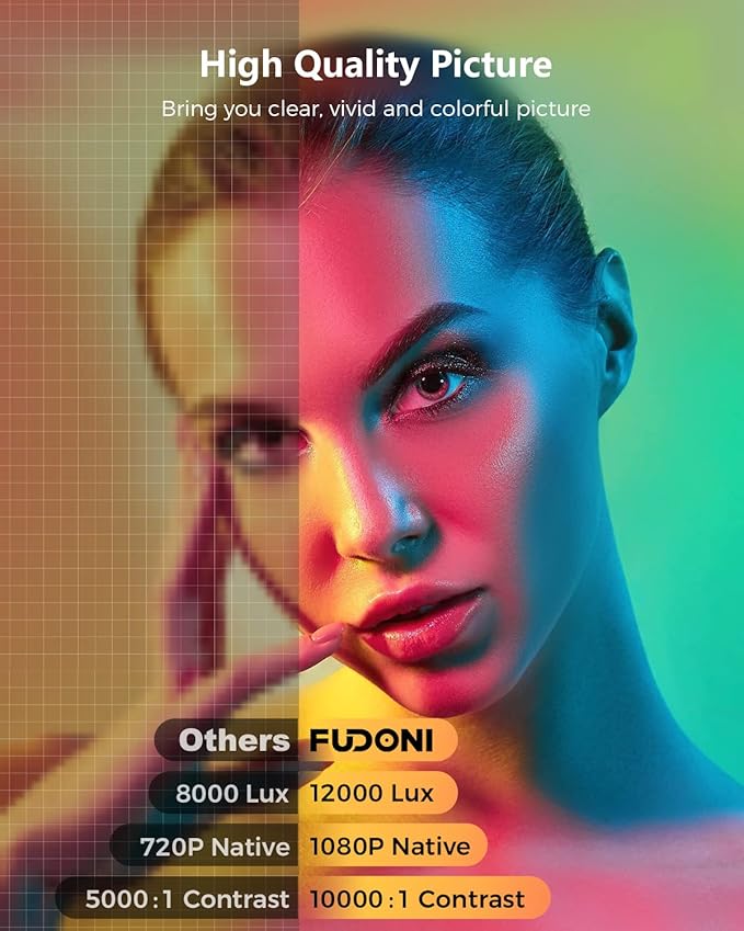 - 【HIGH-QUALITY SOUND PROJECTOR】Built-in dual HiFi speakers for great stereo surround, this home theater projector with speaker is the best choice for indoor and outdoor use. More important, the FUDONI Bluetooth projector with 5.1 Bluetooth allows you to easily connect your ideal soundbar, headphone, or other audio equipment.