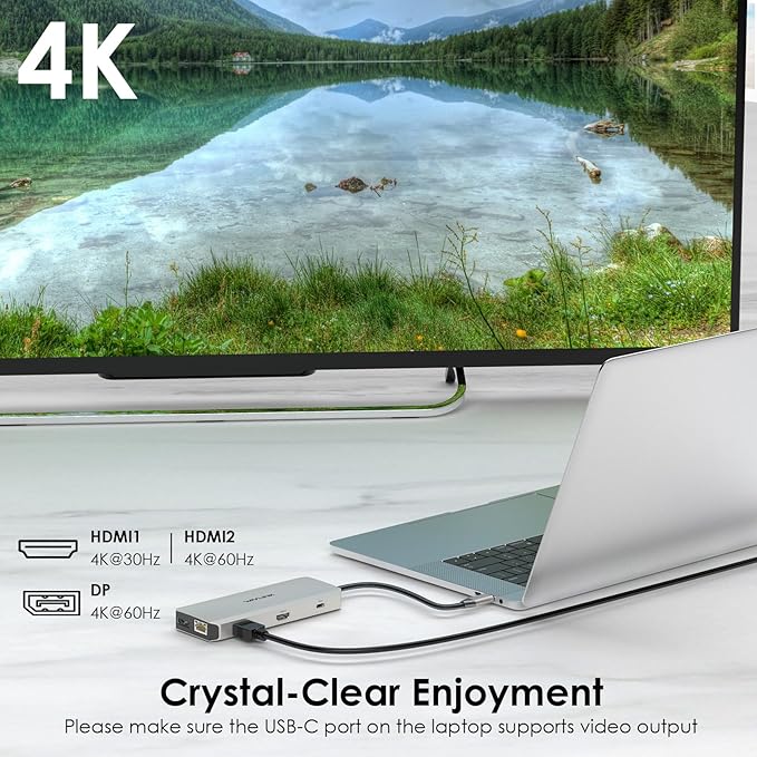 - Triple Display USB C Dock: Only Windows OS supports the Triple display, Mac OS is not supported, you use it to connect macbooks, it only support mirror mode without triple display. Under DP1.4 source, USB-C docking station with HDMI 1 up to 4k@60Hz, HDMI 2 up to 4k@30Hz, DisplayPort up to 4k@60Hz high-definition video output ports. When dual or triple display resolution is 2K@60Hz. Under extended mode, you can have 4 multiple displays, 2 HDMI outputs, a DP output and a laptop screen