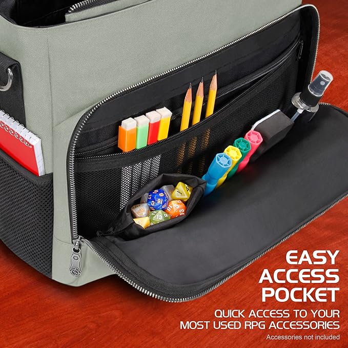 - LARGE LOOT POCKET: Spacious zippered front pocket can store dice, pencils, markers, tokens, small journals and much more to hold your entire game night in one convenient travel bag