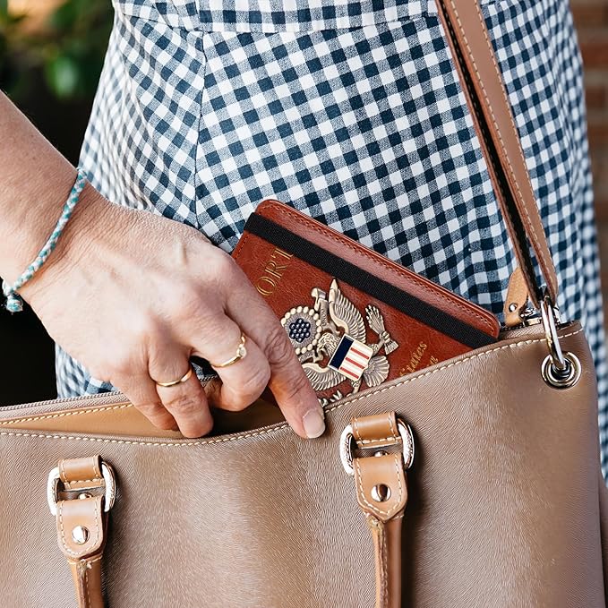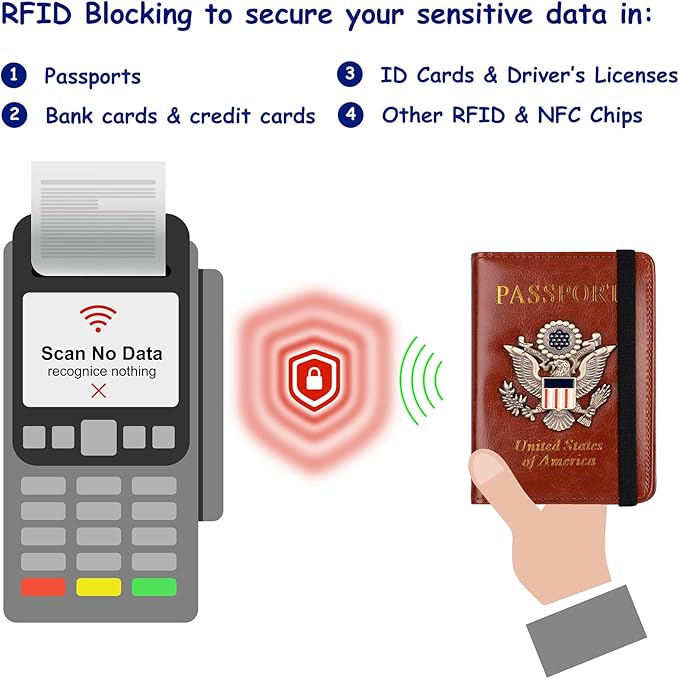 - RFID Security: The leather passport holder rfid blocking has a special material to block RFID signals so that the passport organizer can protect your personal information in your passport and credit cards from unauthorized scans. RFID blocking shielding material of the passport holder men women is used to prevent thieves from swiping your credit card to steal your personal information in airports or crowded places.