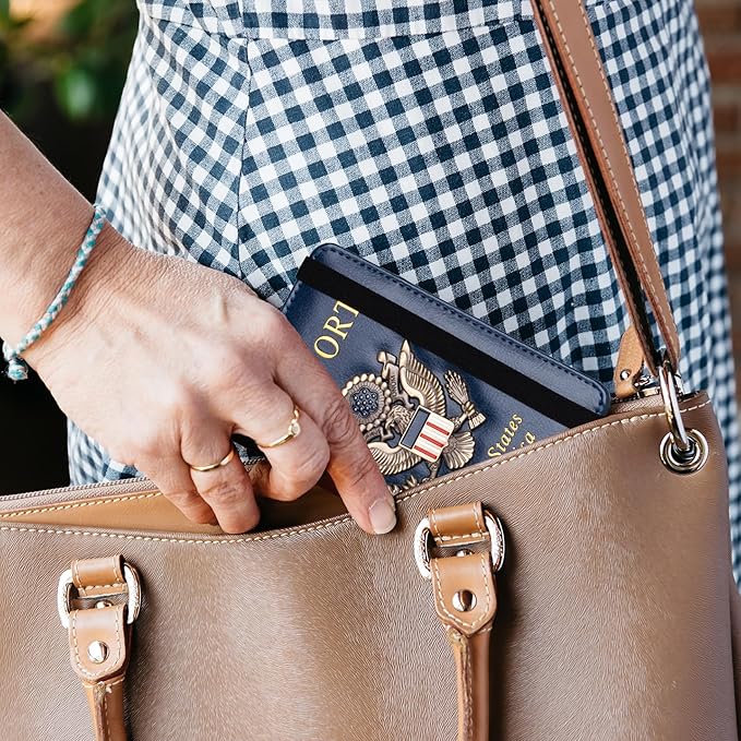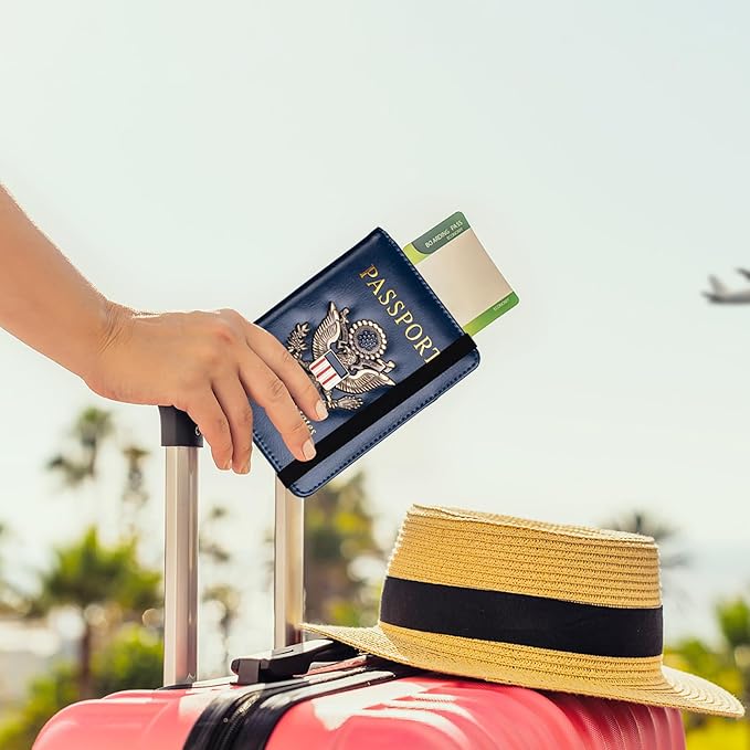 - RFID Security: The leather passport holder rfid blocking has a special material to block RFID signals so that the passport organizer can protect your personal information in your passport and credit cards from unauthorized scans. RFID blocking shielding material of the passport holder men women is used to prevent thieves from swiping your credit card to steal your personal information in airports or crowded places.