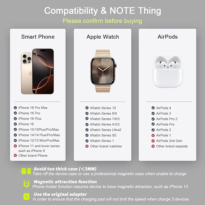 - Compatible Phone Models : iPhone 16, iPhone 16 Plus, iPhone 16 Pro, iPhone 16 Pro Max, iPhone 15, iPhone 15 Plus, iPhone 15 Pro, iPhone 15 Pro Max, Phone 14, iPhone 14 Plus, iPhone 14 Pro, iPhone 14 Pro Max, iPhone 13 mini, iPhone 13, iPhone 13 Pro, iPhone 13 Pro Max, iPhone 12 mini, iPhone 12, iPhone 12 Pro, iPhone 12 Pro Max, AirPods 2/3/4/Pro, IWatch 2/3/4/5/6/SE/7/8/9/10(Compatible with MagSafe cases) Note: Do not compatible for Samsung Galaxy, Android model iPhone 16, iPhone 16 Plus, iPhone 16 Pro, iPhone 16 Pro Max, iPhone 15, iPhone 15 Plus, iPhone 15 Pro, iPhone 15 Pro Max, Phone 14, iPhone 14 Plus, iPhone 14 Pro, iPhone 14 Pro Max, iPhone 13 mini, iPhone 13, iPhon⦠See more