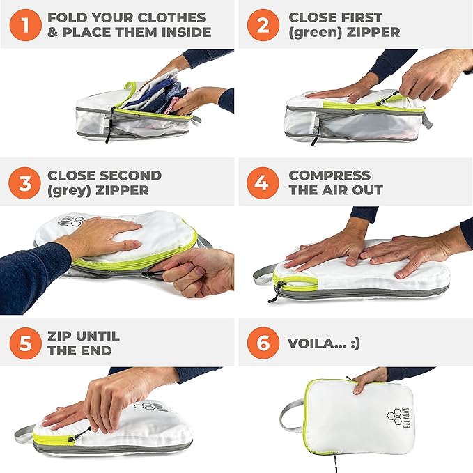 - EASY TO USE - Compression packing cubes are essentially ultralight bags for your clothes that suck the air out and compress to about half their size thanks to a revolutionary dual-zip system. The top zip closes the bag, and the compression zip pushes the air out and compresses your clothes by as much as 50% without any equipment (unlike vacuum bags). Compression is fast and effortless.