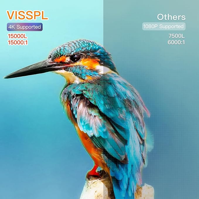 - ★【4K supported & 17Million Color Range】Featuring 4K supported resolution, 15000L brightness, 15000:1 contrast, VISSPL video projector provides over 80% sharpness and brightness than other 1080P projectors in the market. With a unique color reproduction technology and 17 million colors range, our video projector presents an expansive color gamut encompassing 121% sRGB and 99% NTSC, ensuring the utmost accuracy in color reproduction. More importantly, our projector can support 4K videos.