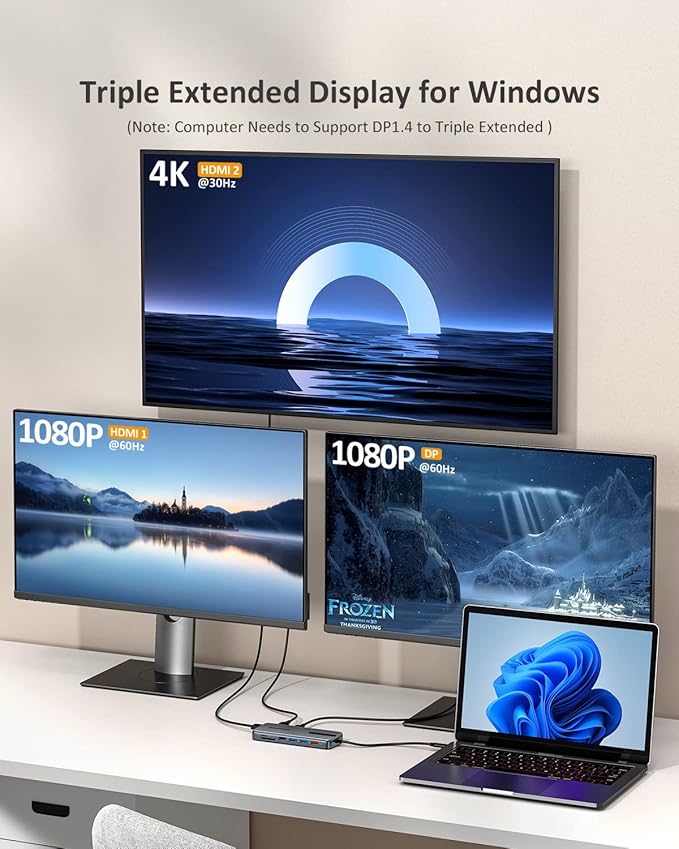 - 【4K Dual Monitor&Triple Display for Windows】The Laptop docking station can easily to achieve dual-monitor and triple-monitor displays for Windows OS. Single screen can achieve up to 4K@60Hz(DP 1.4), Windows users can achieve BC/BCD effect when dual monitor or triple display, up to 4K@30Hz. (Note:Display effect will vary due to computer parameters).♥♥Please note that: Mac OS ONLY support mirror mode, up to 4K@60Hz♥♥
