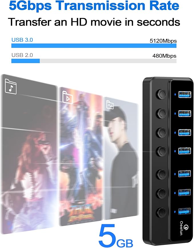 - USB Hub Powered: Qeefun usb port hub offers additional 12V/2A external powered port, improves load capacity and stable data transmission, can connect multiple high-power devices at the same time like HDD, SSD.(This Port is not designed to charge devices.)