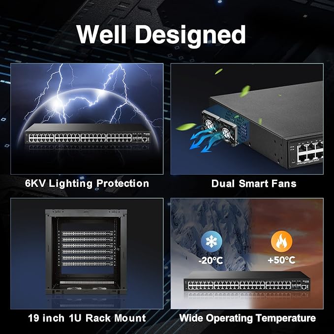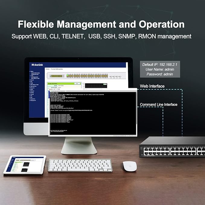 - Easy to Management: Support various management methods such as Web, CLI (console port, telnet, SSH), SNMP, RMON. The WEB interface has been professionally designed, beautiful, concise and easy to use, with rich CLI commands, suitable for general and professional network management.