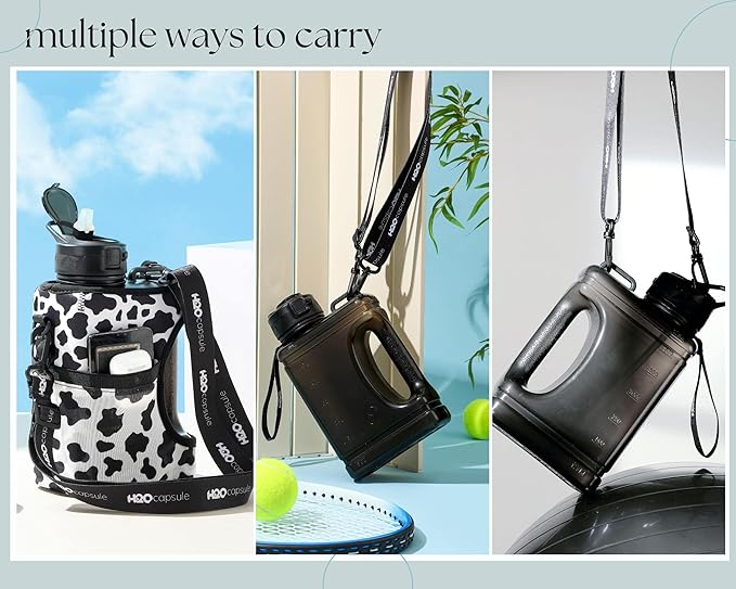 - STAY HYDRATED IN STYLE: No more wrestling with your keys, or leaving your phone on the dirty gym floor. The H2O Capsule is the only sports water bottle with a protective sleeve that doubles as handy storage! Hold your phone, keys and cards while you work out and look good doing it. This half gallon jug is designed with durable materials with a handle to carry wherever you go!