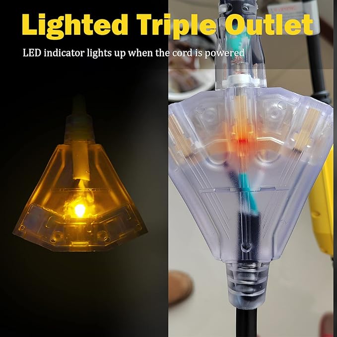 - Lighted Extension Cord End - LED indicator lights up when the cord is powered to let you know the triple tap extension cord is ready to use and easy to be found in the dark.