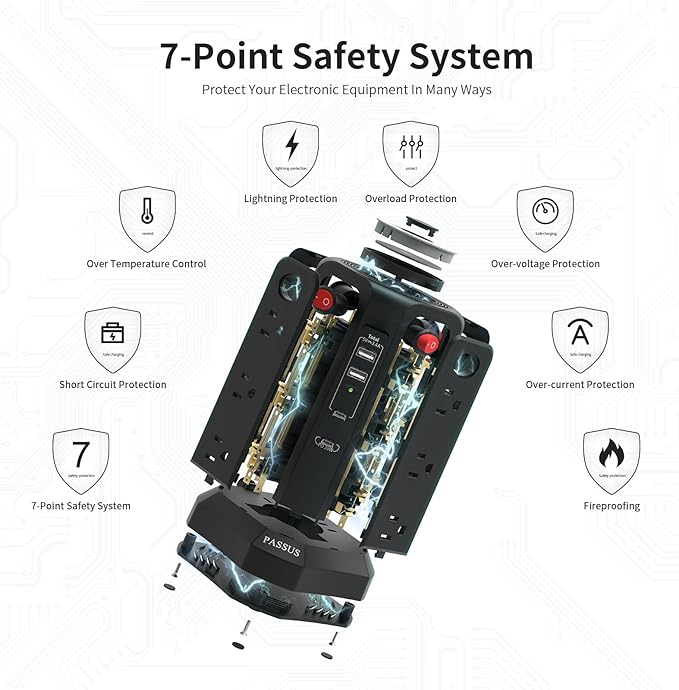 - Smart Power Strip with Night Light: PASSUS power strip tower with night light mode features three brightness levels. The soft and comfortable light is just enough to light the surrounding area, enhancing safety at night. You can manually turn on/off the night light to meet your needs.