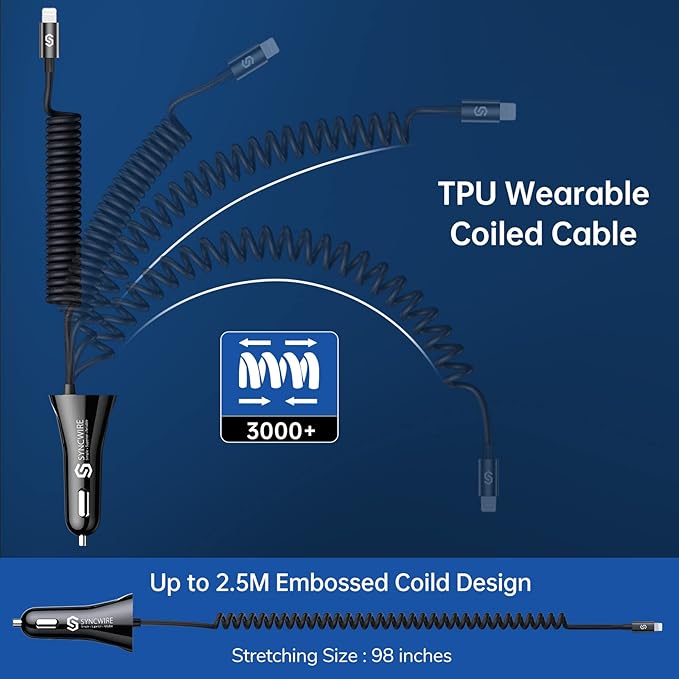 [Apple MFi Certified] Syncwire Car Charger iPhone 4.8A/24W Fast Car Phone Charger Cigarette Lighter USB Car Adapter with Build-in 8FT Lightning Cable Coiled for Apple iPhone 14/13/12/11/XR/Max, iPad