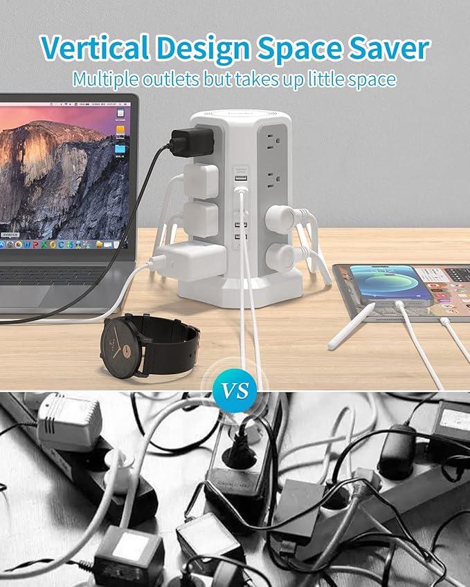 - 【Tower Space Saving Design】With a tower design, this multi outlet tower can save space on the ground by making use of vertical space, making it a great charging station.