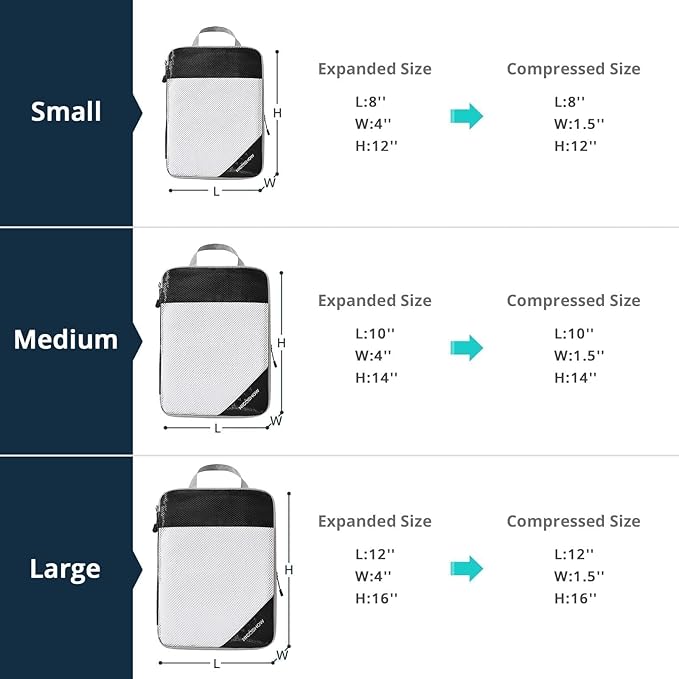 - What Will You Get: NICOSHOW 3-set compression packing cubes for travel include 1 small cube (12''x8''x4''), 1 medium cube (14''x10''x4''), 1 large cube (16''x12''x4'')