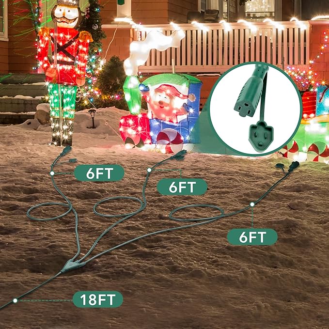 - Designed for Outdoor: This versatile green 3-way extension cord splitter helps use less cords to set up landscape lighting and Christmas decorations easily. With three outlets you can plug in light strings, holiday decorations, stake lights, or lawn accessories up to a total of 13 amps/1625 watts.