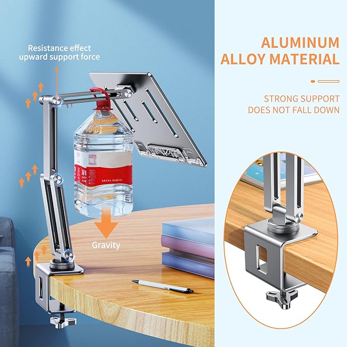 - Stable and Durable: This iPad stand uses industry high standard dual spindle design strong damping force, support does not fall down. Aluminum alloy material is solid and durable, anodized high hardness aluminum alloy CNC finely carved, outstanding texture. Damping pivot arm, the middle damping pivot strong upward reaction force, it will not loosen or swing when using or clicking the screen for a long time