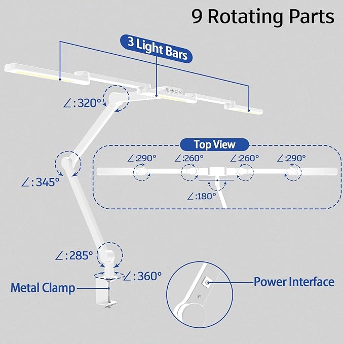- 【Transformable And Rotatable】: Epabina swing arm desk lamp features 9 rotatable parts with 3 super bright light bars design. The two 7-inches light bars, the clamp base, and the two connecting panels as well as the bracket are all rotatable. You can twist the office lamp into so many different configurations to direct light to suit your needs, perfect for artwork, design work, handcrafting, sewing, reading, drawing, working, drafting or crafting.