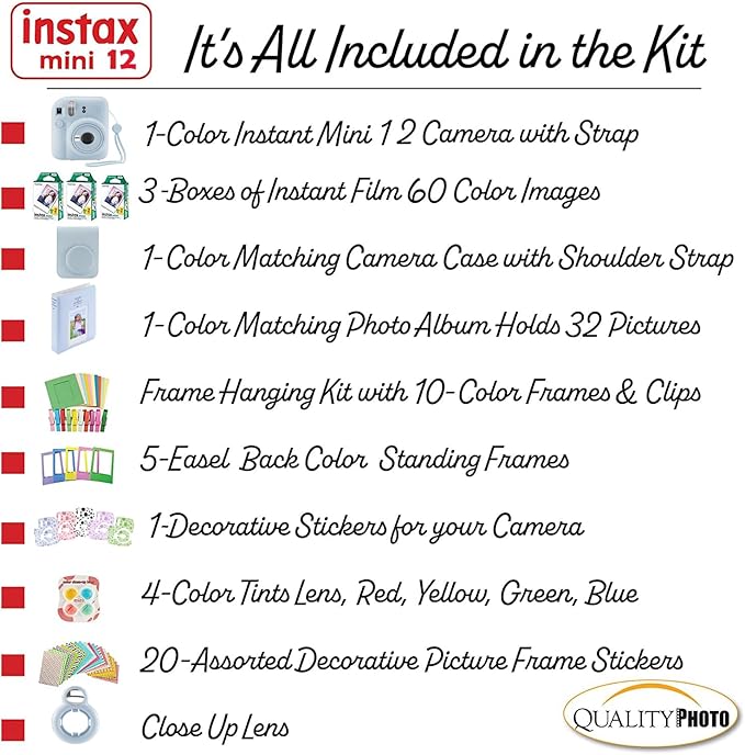 - Value accessory bundle. Includes the famous Fujifilm Instax Mini 12Camera (color your choice) with a matching Camera Case to keep the camera protected