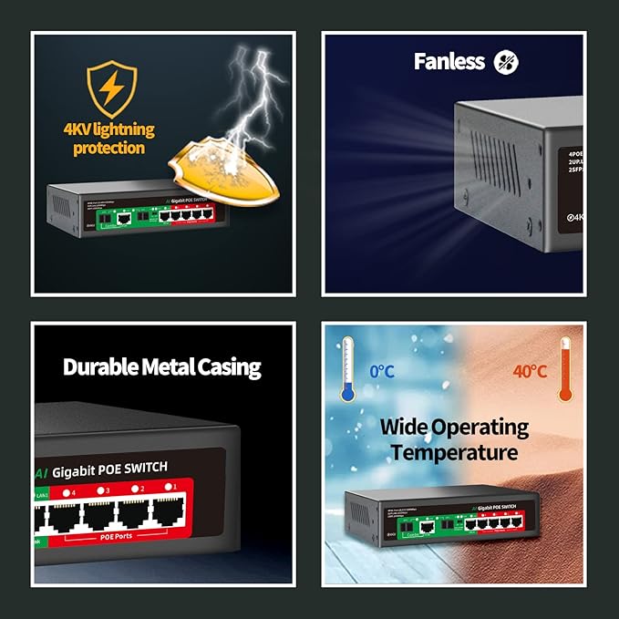 - 【Stable, Powerful, Plug&Play】STEAMEMO full gigabit poe switch provides reliable data transfer and Fanless design ensures quiet operation. Plug and play, easy setup with no software installation or configuration needed. Study metal case fanless Quiet Design, desktop or wall-mounting Design.