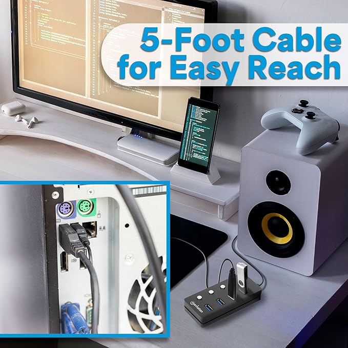 4 Port USB Extension Cable Hub with (5ft Long Cord) – USB 3.2 Powered USB Splitter On/Off Switches – USB Extender/Multiport Adapter for Desktop Computer, Laptop, PC Accessories