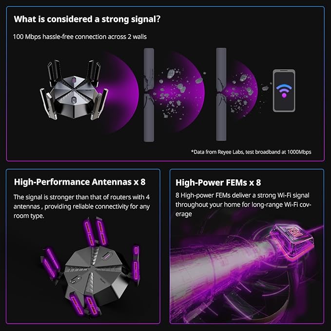 - Eight Front End Modules (FEMs) and Eight Antennas: With enhanced signal transmission and reception to overcome multiple obstacles, the Reyee E6 router minimizes lag and latency for gaming anywhere in your home by delivering full-strength whole-home coverage.