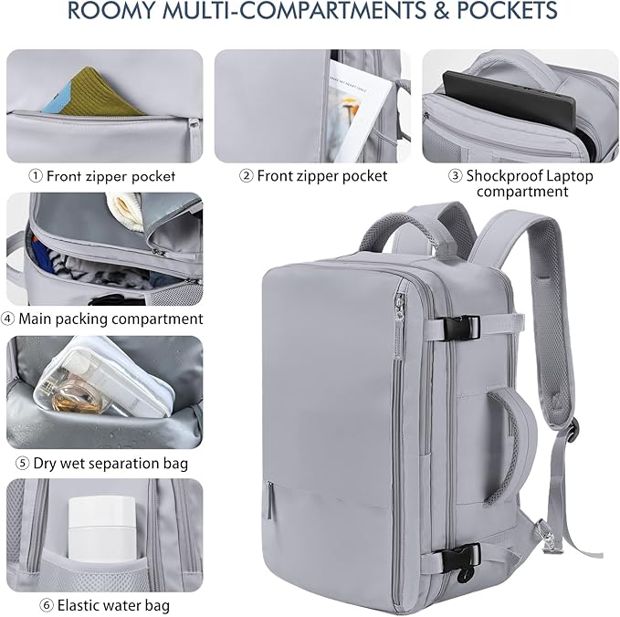 - 【Large Capacity Backpack】24L large travel backpack has multiple compartments, which can meet the needs of 2-3 days travel. Main pocket x1, laptop padded compartment x1 (fit up to 16” laptop), wet bag x1, front zipper pocket x2, mesh pocket at side for water bottle or umbrella, back anti-theft zipper bag which can store valuables such as mobile phone or cards, and other convenient inside pockets for travel essentials. These small designs keep your items neat and easier to find