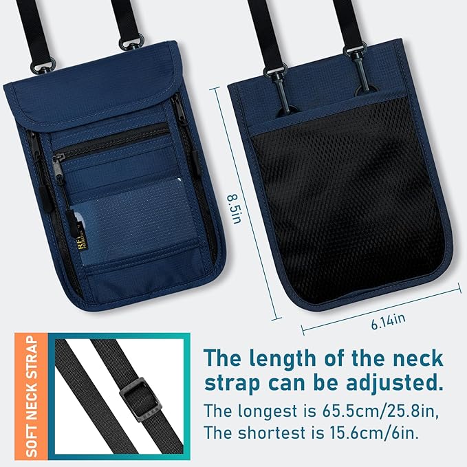 - Slim and lightweight - This secure passport clip is 5.6 inches wide and 8 inches high, slim enough. This travel wallet includes a soft and adjustable neckband that adjusts from 15 inches to 55 inches according to your needs. Hanging around the neck or hidden under clothes does not add unnecessary volume, providing comfort and convenience.