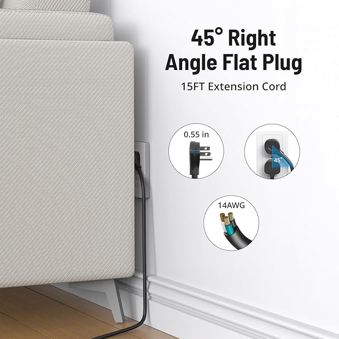 - 15ft Extension Cord Flat Plug: This surge protector is made of 14 AWG pure copper for extra durability, the 15ft extension cord is heavy duty and has better current carrying capacity (15a). The low profile right angle flat plug eliminates awkward cords from cluttering and doesnβt block the bottom receptacle