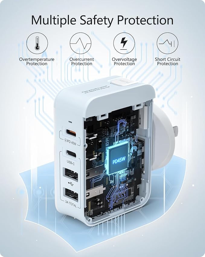 - 【What You Get】Including a mains plug with 1 x USB PD port (45W max), 1 x USB C port (15W max) and 2 x USB ports (12W max per port) mains plug, interchangeable UK/USA/EU/AUS plugs and a friendly user manual.