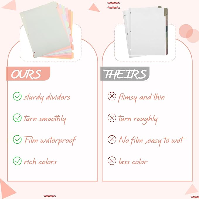 - Coated with a Plastic Film: our binder dividers and tabs are coated with a plastic film, which will reduce the scratches on them and make them not easy to bend; With this film, the water will not wet the paper, so you can use them with confidence