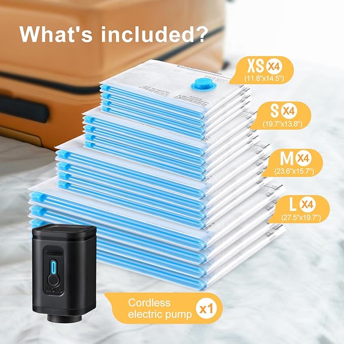 - 16 Pack Travel Vacuum Bags:4 x L(27.5"x19.7") /4 x M(23.6"x15.7")/4 x S(19.7"x13.8") / 4 x XS(11.8"x14.5") / 1 x Electric Pump(NOTICE: The electric pump has a travel safety lock setting, if the device flashes red, press the switch for up to 3 seconds until the device light converts blue light to use the electric pump)