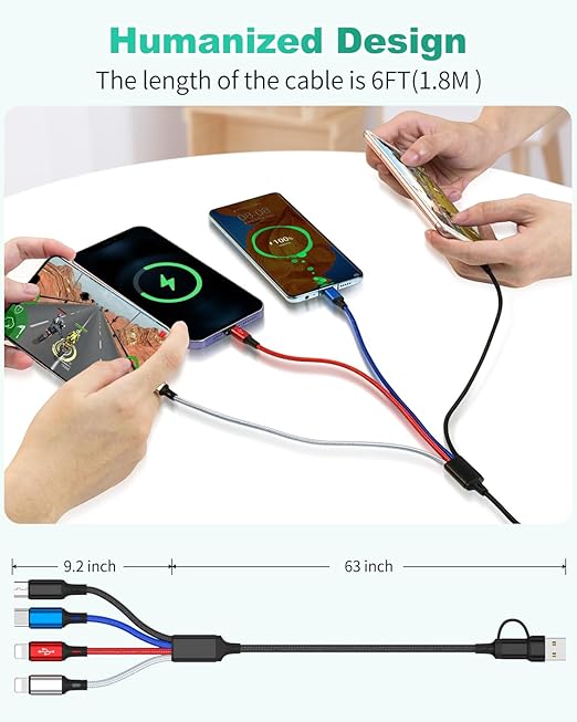 - [ Convenient Design ] Ideal length 6ft/1.8M is optional to use in car, travel, office and home, these multi charging cable USB C are the most convenient cable length. With useful sticky buckle, easy to storage and carry around. You can put this multi cable charging cord in your handbag or backpack. 30cm branch line length let you enjoy videos, games and charging at the same time. Take 1 charger cable meet your all charging demands.