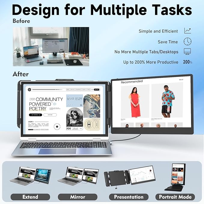 - ➤【Convenient Work & Save Time】:Our attachable portable monitor extender screen for laptop provides multiple display modes [Mirror mode/extension mode/lanscape and portrait mode], it can also switch the screen view between horizontal and vertical modes, which definitely save your time and increase your work efficiency and enjoy your leisure time. Perfect for remote worker,traveler, IT professionals, Players, Stock traders, Programmers, game player ect!