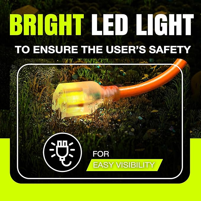- LIGHTED END FOR VISIBILITY & SAFETY: With a lighted end to indicate power and a brightly colored PVC jacket, this three prong extension cord minimizes tripping hazards and improves safety in busy or poorly lit areas. Stay safe while powering up with an easily noticeable extension cable. The innovative design not only enhances operational safety but also ensures that the indoor / outdoor power cord is easily identifiable among your tools and equipment, preventing accidental disconnections.