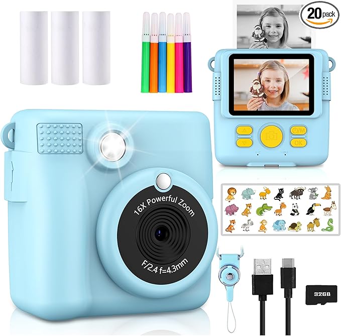 Instant Print Camera for Kids,Christmas Birthday Gifts for Age 3-12 Girls Boys,1080P HD Digital Video Cameras for Toddler,Kids Portable Toy with 3 Rolls Photo Paper,32GB Card-Blue