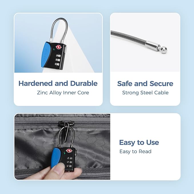 pack all TSA Approved Cable Luggage Locks, 3 Digit Combination Padlocks, Travel Lock for Suitcases & Bag, Alloy Body, Travel Accessories (1 Pack)(Navy)