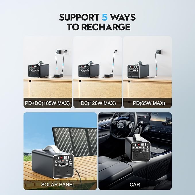- 5 RECHARGING WAYS: Powdeom power bank with outlet can be recharged by a wall outlet, PD port, car charger or 60w solar panel, even wall outlet and PD port charging together. No matter whether you are outdoors camping, taking a trip, or at home resting, it can be charged and fully used, keeping you stay connected to unlimited energy.
