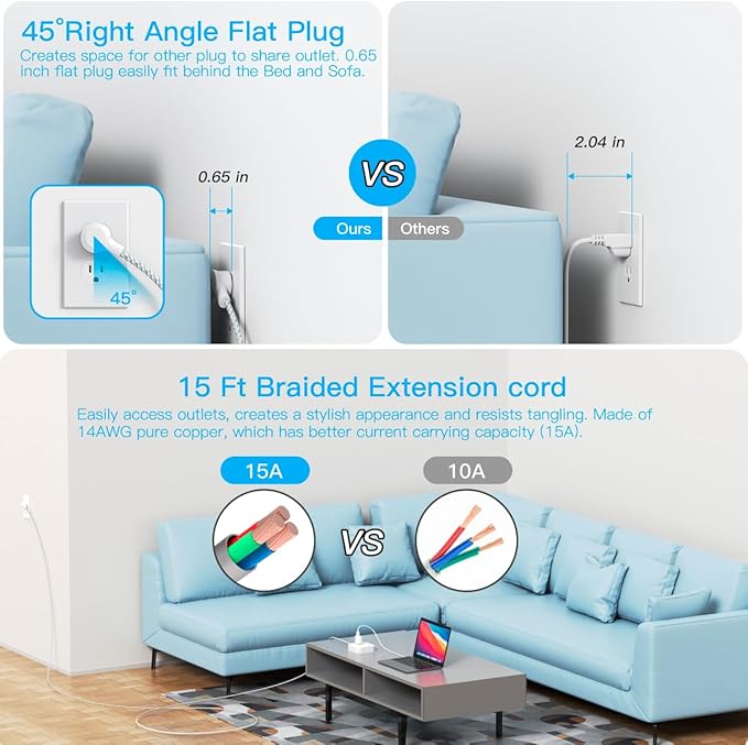 - 【Upgraded Power Cord & Right Angle Flat Plug】- The 15ft-long extension cord is made of 14AWG pure copper, which is very thick and has better current carrying capacity (13A). The braided power cord is not easy to deform, durbale and more safety than other power cord. 45-degree low-profile angled plug design doesn’t block the bottom receptacle of your duplex wall outlet.