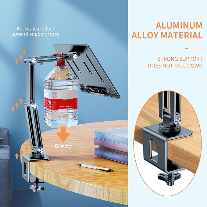 - Stable and Durable: This iPad stand uses industry high standard dual spindle design strong damping force, support does not fall down. Aluminum alloy material is solid and durable, anodized high hardness aluminum alloy CNC finely carved, outstanding texture. Damping pivot arm, the middle damping pivot strong upward reaction force, it will not loosen or swing when using or clicking the screen for a long time