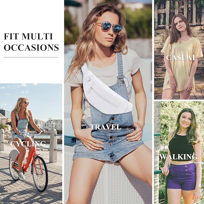 - Changeable Style Fanny Pack,Many Ways to Wear — Since the comfortable long strap is widely adjustable for most waist size(20” - 50”).There are many ways to wear this fanny pack - You can wear it in front of your waist, as a belt bag,back on your hip, slant across your chest or over You shoulder.Perfect for various occasions.