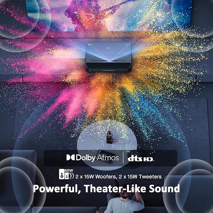 - Special Feature : ①4K Tri-Color Laser Ultra-Short Throw②Out-of-the-box color accuracy③Dolby Vision & Atoms ④Active 3D ⑤Lowest input lag among all UST projectors⑥Cinematic Sound with 60W Speakers (2x15W Tweeters and 2x15W Woofers) ⑦107% Rec.2020 color gamut ①4K Tri-Color Laser Ultra-Short Throw②Out-of-the-box color accuracy③Dolby Vision & Atoms ④Active 3D ⑤Lowest input lag among all UST projectors⑥Cinematic Sound with 60W Speakers (2x15W Tweeters an… See more