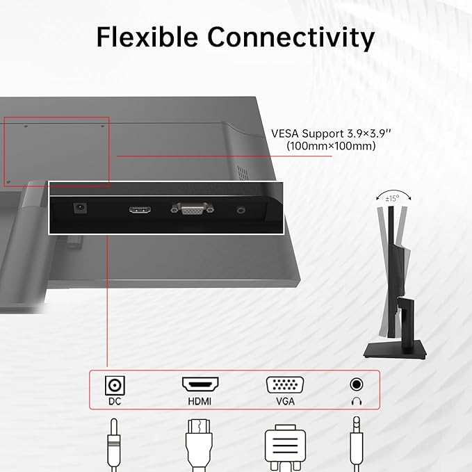 - [Adjustable Viewing Angle] Tiltable from -5° to 15°,VESA mounting compliant (100 x 100mm), to adapt to different environments and use cases,effortlessly adjust to your preferred angle for maximum comfort.