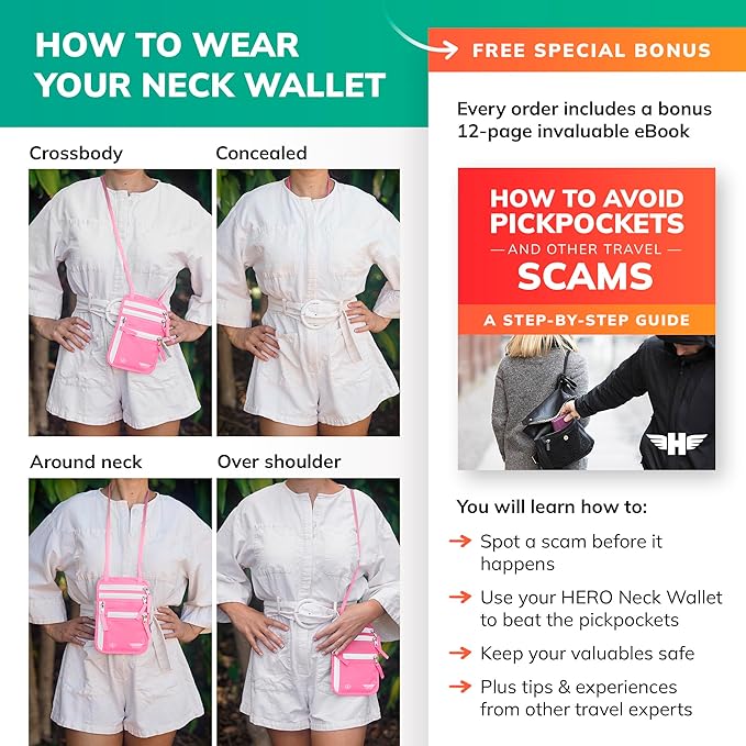 Hero Travel Supply Neck Wallet, RFID Blocking Passport Holder, Easy to Conceal Pouch (Hot Pink)