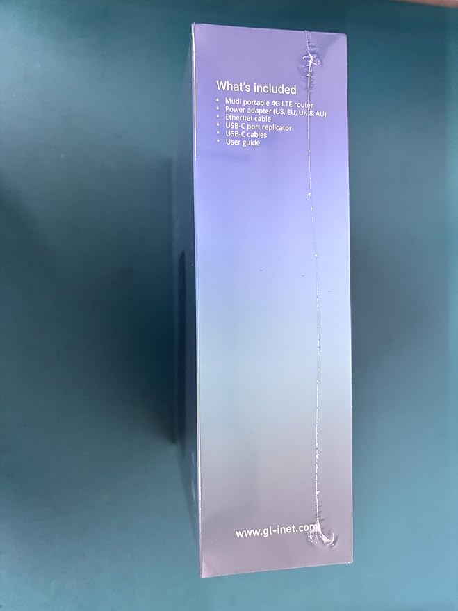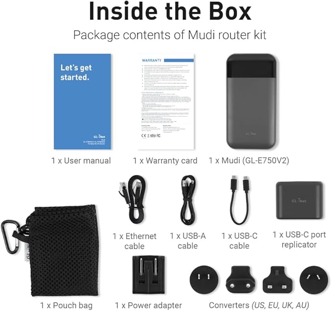 - Included Components : GL-E750V2 (Mudi) router with 2-year warranty, USB-C to USB-A cable, USB-C to USB-C cable, USB-C port replicator, Power adapter (US, EU, UK, AU Plugs), EM060K Cat6 4G module pre-installed, Ethernet cable, User manual. GL-E750V2 (Mudi) router with 2-year warranty, USB-C to USB-A cable, USB-C to USB-C cable, USB-C port replicator, Power adapter (US, EU, UK, AU Plugs), EM060K Cat6 4G module pre-installed, Ethernet cable, User manual.