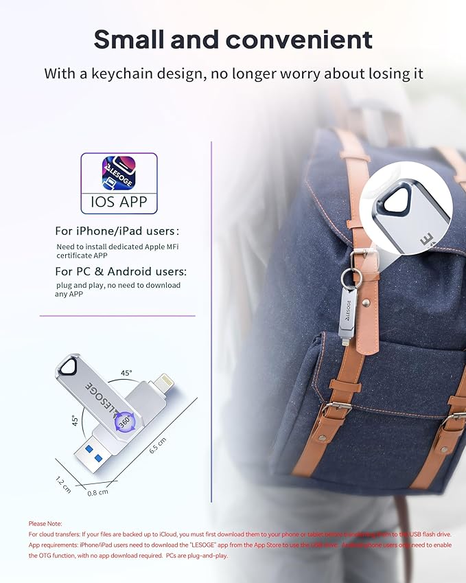- Reliable after-sales service: Experience the convenience of high-quality USB memory stick and enjoy our premium customer service at the same time. For the lightning flash drive, if you have any questions, we are willing to provide help.(Note: When using a pendrive , iPhone/iPad need to download the "LESOGE" app from the App Store; Android and PC devices can be used directly without downloading any app)