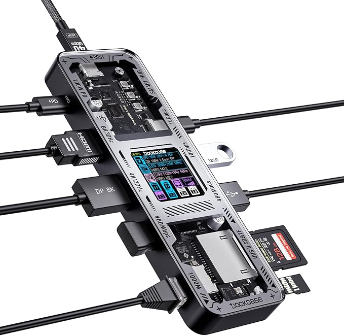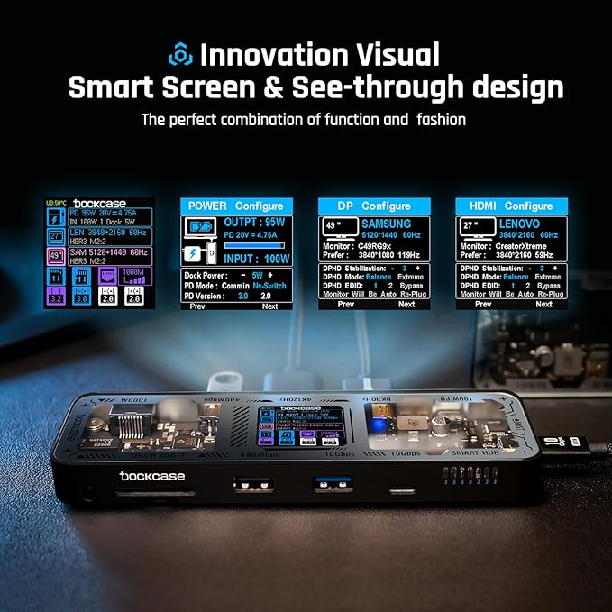- Dockcase Smart USB-C Hub: 10-in-1 Explorer Edition, the ultimate smart hub for your workspace. With an adjustable function display combined with versatile ports and connections, you can easily expand your laptop or desktop computer into a complete workstation