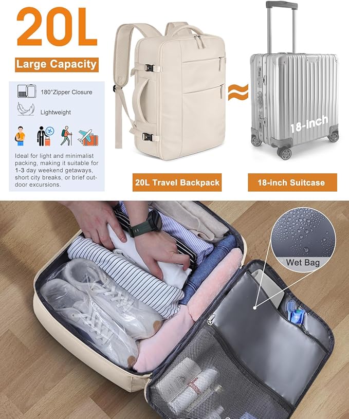 - 3 in 1 Backpack with 20L Capacity :Side handle helps you seamlessly transition from a backpack to a carry-on bag, providing flexibility for any travel scenario. The backpack mode ensures comfort and frees your hands during explorations, while the luggage strap allows you to effortlessly secure it to your suitcase, adding an extra layer of convenience. Elevate your travel experience with a bag that adapts to your needs, offering style, functionality, and the perfect travel solution all in one