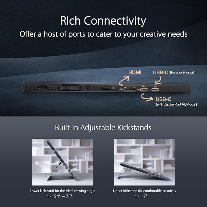- Two innovative kickstands prop the display up at different angles to suit different needs