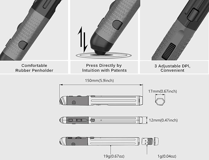 - 【Achieve smooth and Precise Tracking】 The Computer Mouse Pen, with its DPI Adjustable options (800/1200/1600) and intuitive pressure-point click design, ensures easy activation of button-click functions with a gentle touch. Effortlessly click anywhere the cursor moves for a seamless and efficient experience.